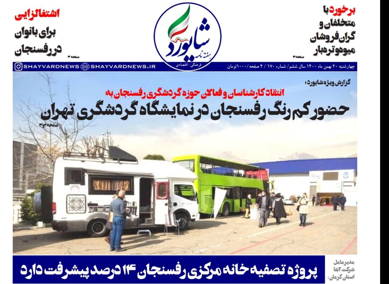 هفته نامه شایورد در این شماره در گزارشی ویژه به حضور رفسنجان در نمایشگاه بین المللی گردشگری تهران پرداخته است، و پای صحبتهای کارشناسان و فعالان حوزه گردشگری نشسته و این نمایشگاه را مورد بحث و بررسی قرار داده است.